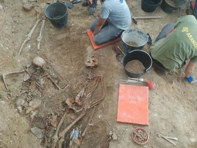 Hasta esta tarde han aparecido ya más de 10 cuerpos, en diferentes fosas y dispuestos en orientaciones diversas, lo que, según Etxeberria, confirma que fueron lanzados de juntas en la fosa. Algunos cuerpos, incluso, no se muestran completos, lo que indica que se abrieron nuevas fosas encima. Otros cuerpos aparecidos, están orientados, "enterrados cristianamente" como ha apuntado Etxeberria, que serían enterramientos previos a la Guerra Civil, y también aparecen algunos restos de féretro. Otros cuerpos que están colocados con orientación y sin restos de féretro confirma que el lugar también servía de fosa común para las víctimas de familias pobres, como ha apuntado el doctor. El hallazgo que a su vez confirma cuerpos asesinados de guerra por el fascismo es que han aparecido varios proyectiles. Junto a los cuerpos han encontrado varios objetos personales: una cuchara, un calzador, un par de zapatos y monedas junto a un crucifijo de un cuerpo no dispuesto de manera cristiana, que indica que eran republicanos católicos.