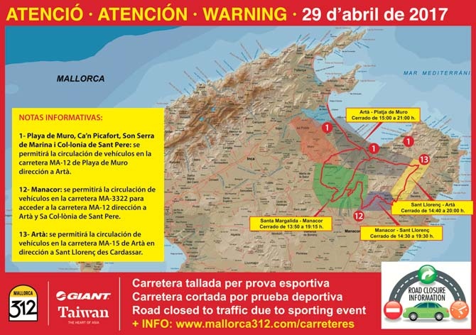De Sant Llorenç a Artà per Son Servera un cop a Son Servera per Pula i/o Canyamel. Carretera dels Rentadors-Xiclate estarà tancada.