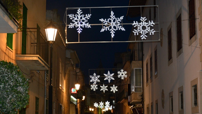 Así de iluminada luce la fachada del Ayuntamiento de Sant LLorenç, al mismo tiempo que las típicas paradas de los mercadillos de Navidad llenan su plaça y la de la Iglesia con sus puestos multicolores.