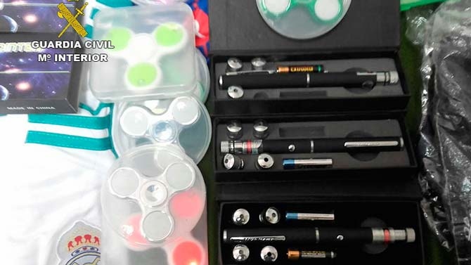 200 prendas deportivas falsificadas, 17 Fidget Spinner peligrosos sin etiquetar, 3 punteros láser clase III.
