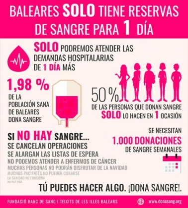 [Img #26751]La Fundación Banco de Sangre y Tejidos de las Islas Baleares (FBSTIB) solo tiene reservas de sangre para atender a las demandas hospitalarias durante un día. Por este motivo, la institución balear hace un llamamiento urgente a la población para que done sangre.