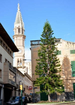 Otra bella imagen de Manacor en Navidad. La plaça d’es Cos con su árbol engalanado para la ocasión, al fondo uno de los emblemas de Manacor, el imponente campanario de la iglesia de Nostra Senyora dels Dolors