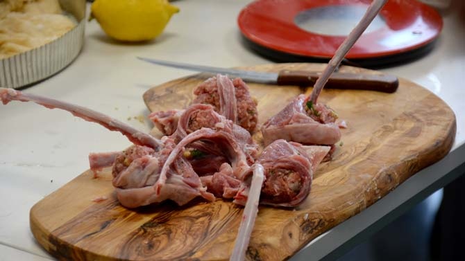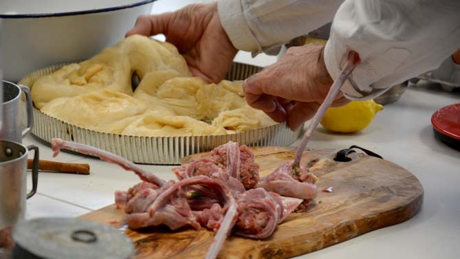 Els plats de Pasqua que ha elegit per aquesta ocasió han estat unes costelles de be farcides de carn i arrebossades de pasta d’ensaïmada, també ha ensenyat còm fer una pasta de panada escaldada, que després ha farcit de patata i ceba i finalment, de plat dolç, una greixonera de Santa Margalida o de punta de diamant, un dolç típic de la cuina conventual antiga, que es fa amb una crema i una base de coca de quarto.