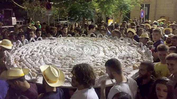 Tras la multitudinaria y profana procesión, y tras la traca final, más de 80kg de este espectacular y genuino dulce de Mallorca se repartieron entre los asistentes en el final de fiesta de Porreres, como marca la tradición.
