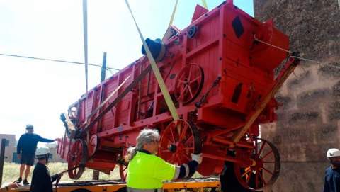La batedora ha estat traslladada aquest matí des del taller de restauració de Patrimoni historicoindustrial que té el Consell de Mallorca a Son Bonet fins a la farinera d’en Beió, a Manacor.