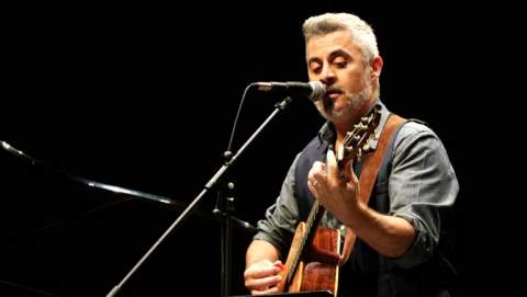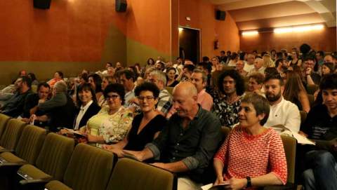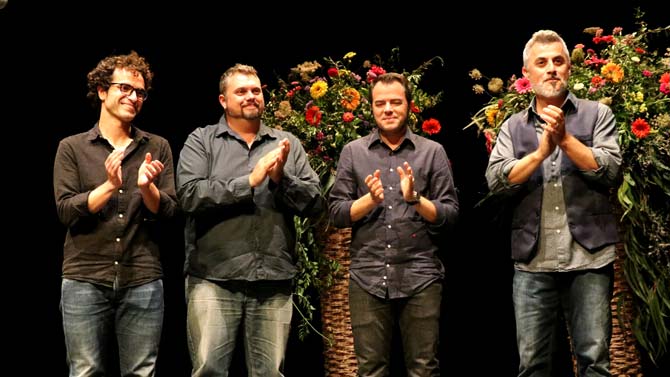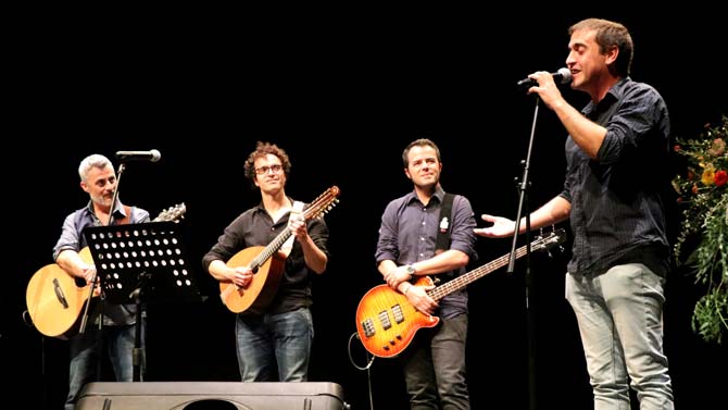 El públic que ha omplit el teatre aplaudeix les cançons i l’entrega del Reconeixement de Mèrits al grup musical Anegats
