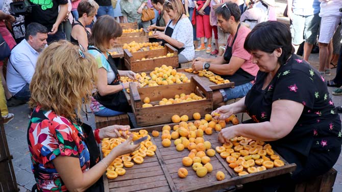 Desde las paradas donde se podía adquirir el fruto al natural en sus múltiples variedades, al tiempo que los amables vendedores explicaban las características de cada variedad y para que te aconsejaba usar cada una de ellas, si para mermelada, o para cocas por ejemplo. Hasta las paradas donde se ofrecían derivados del preciado fruto, uno se asombra de sus múltiples utilidades, entre ellas está la elaboración del licor y granizado, las mermeladas, los albaricoques secos y quizás una de las formas más preciadas es como ingrediente en las cocas, ya sea como adorno o como parte del relleno o la masa, o en la gastronomía en general aunque sea en platos salados, no olvidemos que en mermelada es  uno de los rellenos más típicos de los famosos “robiols”.