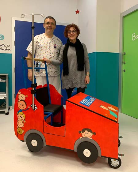 Els nens ingressats en l'Àrea d'Urgències disposen des d'aquest dimarts d'un cotxet. Aquesta és una acció de les que formen part de la humanització del centre hospitalari i ha estat possible gràcies a la feina que han duit a terme dos treballadors del mateix hospital. Antònia Domenge i Miquel Martí, ambdós auxiliars d'infermeria, han estat els dissenyadors i constructors del cotxe que ha estat realitzat en fusta, pintat i decorat amb motius infantils.