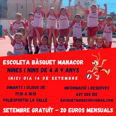 L’ESCOLETA del Club Bàsquet Manacor començarà dia 14 d’setembre al poliesportiu de La Salle de Manacor. Els dies de l’activitat seran els DIMARTS i els DIJOUS de les 17:15 a les 18:15 i durant el mes de setembre podeu venir a provar de manera totàlment gratuïta.