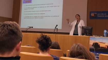Seguidamente los alumnos han recibido información diversa sobre los servicios y los diferentes grupos de trabajadores que conforman el Hospital por parte de los profesionales de Atención al paciente y docencia de enfermería. Después han participado en un taller sobre la importancia del lavado de manos y la salud y finalmente han participado en una charla sobre Psiquiatría y adolescencia, dada por la Dra. Rosa Molina, jefe del servicio.