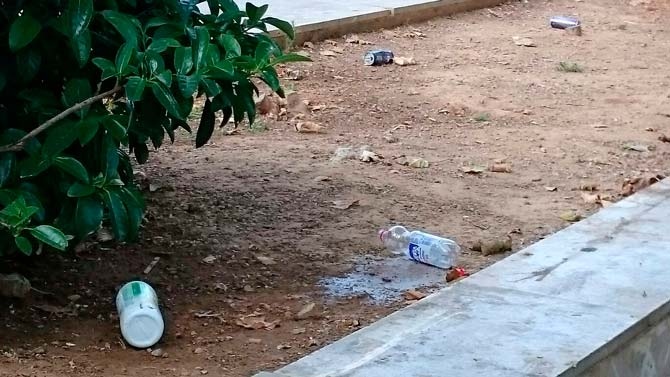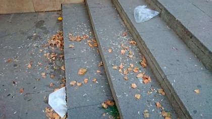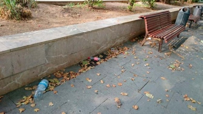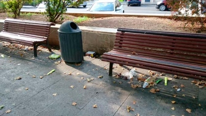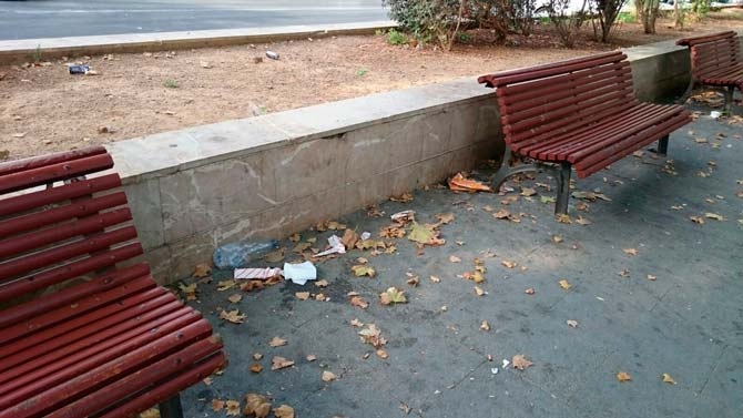 Restos de helados y sus correspondientes envoltorios, botellas de todo tipo, papeles, bolsas de plástico, junto a las huellas de las “cacatúas urbanas” que anidan en bancos y escaleras dejando sus cientos de cáscaras de pipas en el suelo. Todo ello con las papeleras al lado, completamente vacías.