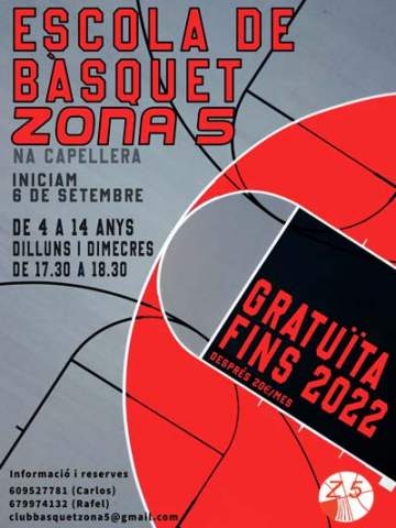 Així doncs, l'escola començarà el dia 6 de setembre, i serà els dilluns i dimecres de 17,30 h a 18,30 h al poliesportiu Bernat Costa de na Capellera. Com sempre, amb monitors titulats!Si voleu més informació o inscriureu-vos, basta us poseu en contacte a través dels telèfons 609527781 (Carlos), 679974132 (Rafel) o pel correu clubbasquetzona5@gmail.com