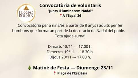 Convocatòria de voluntaris "Junts Il·luminarem Nadal" a l'Espai 36. Leer más...
